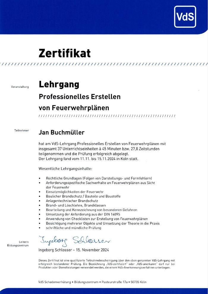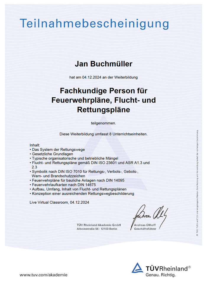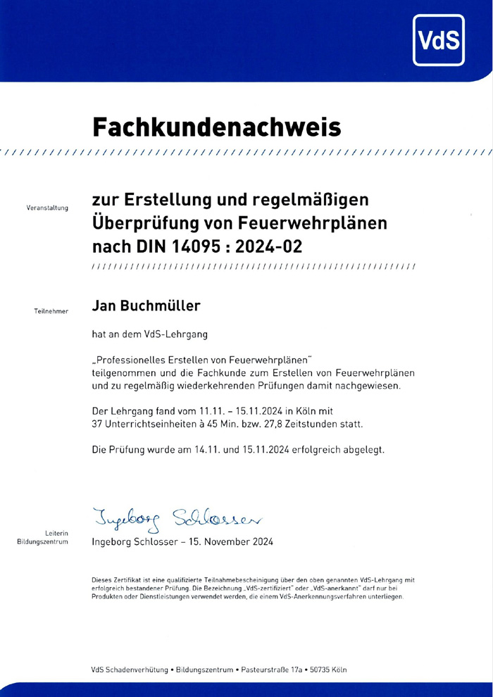 Ich bin ausgebildeter Feuerwehrmann und Fachkundige Person für die Erstellung von Feuerwehrplänen sowie Flucht- und Rettungsplänen. Mit meinem umfassenden Wissen über Sicherheitsvorschriften und Einsatzstrategien stelle ich sicher, dass die Pläne den erforderlichen Standards entsprechen.